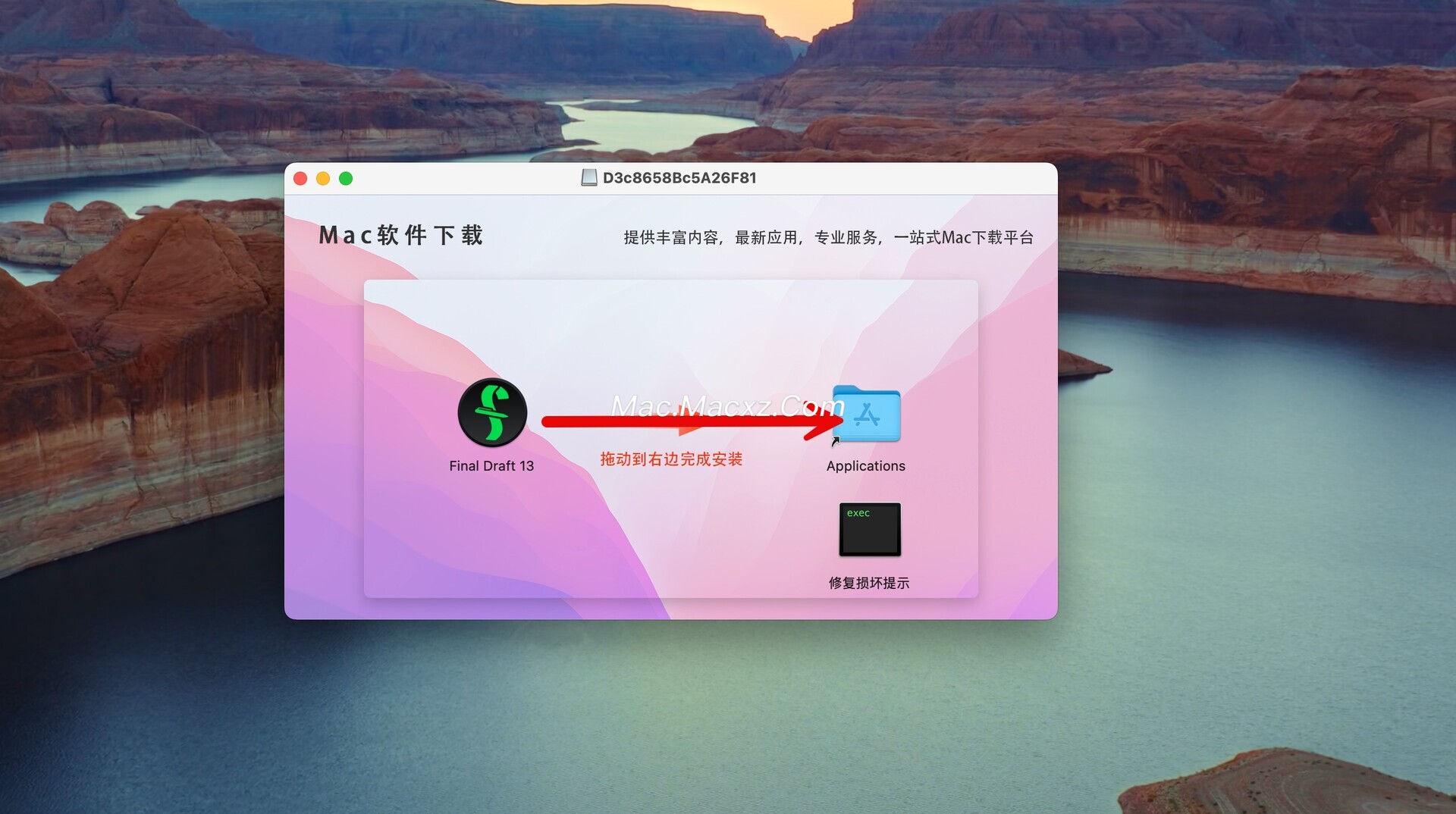 Final Draft Mac下载完成后打开,拖动左侧的软件到右侧应用程序中即可